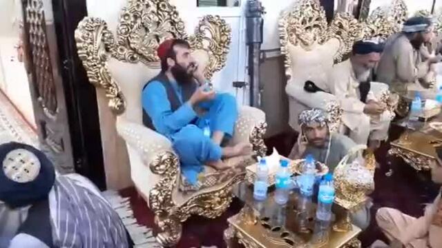 Trong video, các tay súng Taliban ngồi trong phòng khách sang trọng với nhiều đồ nội thất dát vàng. Một số người ngồi khoanh chân trên thảm sàn, ăn bánh và vờ uống nước từ bộ ấm trà bằng vàng.