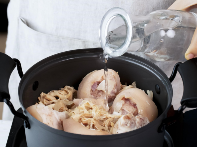 Chân giò đầu tiên nấu với nước pha muối và giấm 5 phút rồi vớt ra ngâm nước đá để trắng giòn.