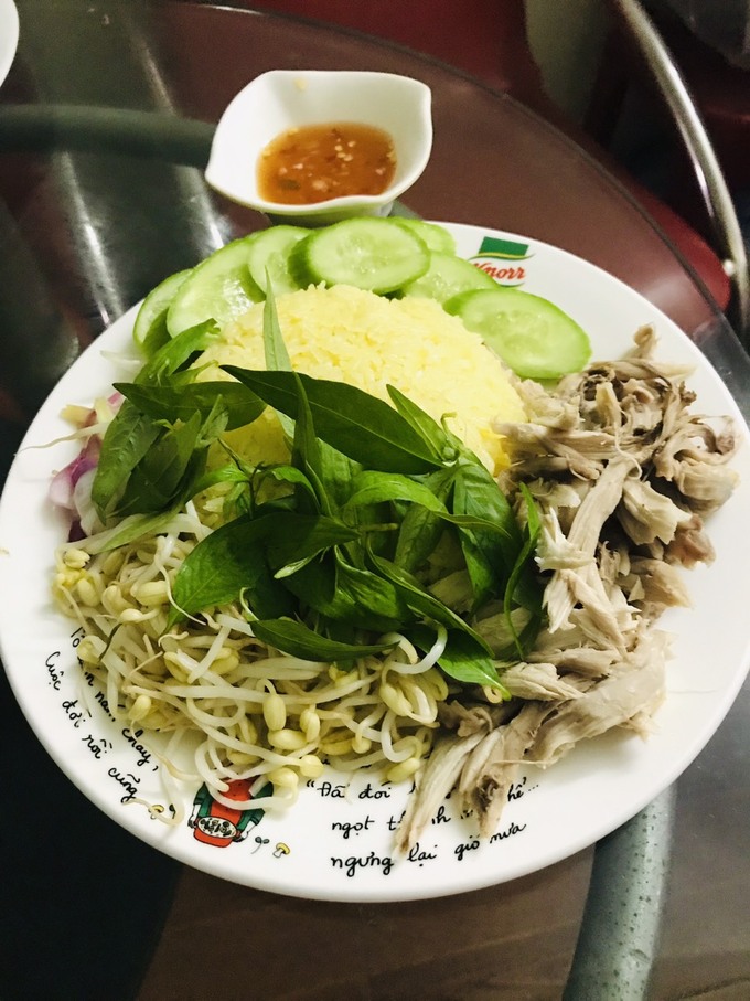 Từng hạt cơm vàng dẻo thơm mùi nghệ, thịt gà ta dai mà mềm, béo ngậy ăn kèm với chén nước mắm chua ngọt đậm đà hương vị.