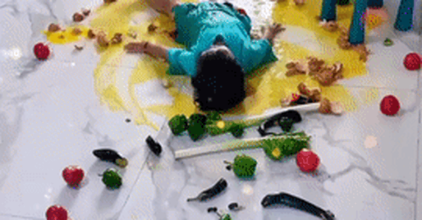 Trong lúc bố mẹ vắng mặt, quý tử đã càng quét căn bếp mang ra nào trứng, nào ớt, nào cà tím trộn lẫn vào nhau và đổ ra sàn nhà để nghịch.
