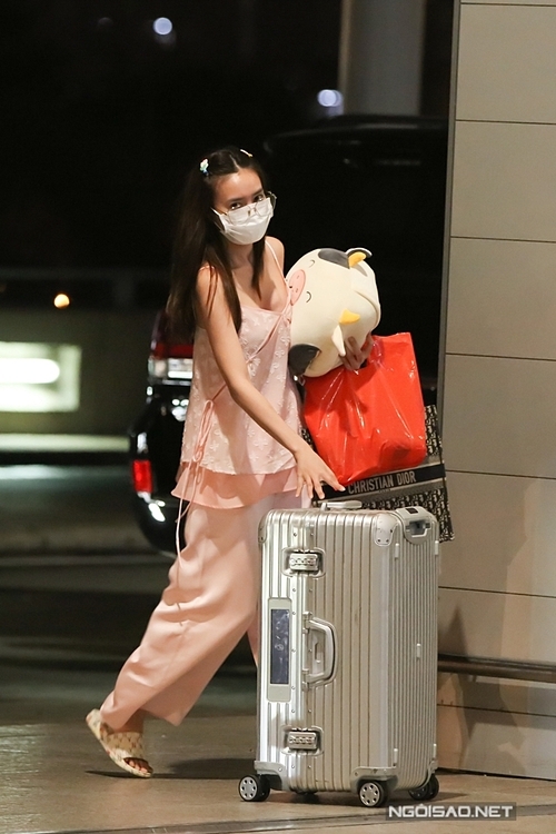 Trong đó, Lan Ngọc là người gây chú ý hơn cả khi xuất hiện với bộ đồ ngủ, kéo theo hai valy lớn. Nữ diễn viên cũng để mặt mộc, xõa tóc và đeo khẩu trang, kính chống giọt bắn cẩn thận.