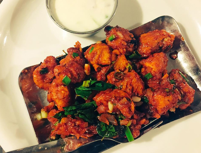 Gà rán 65 có tên gọi xuất phát bằng lần đầu xuất hiện trong menu của nhà hàng Buhari Hotel ở Chennai, Ấn Độ vào năm 1965. Miếng gà được ướp với bột ớt đỏ, rau mùi, tỏi, gừng và tiêu đen trước khi cho vào chiên. Để hoàn thành món ăn, các miếng gà rán được áp chảo cùng sữa chua cay và nước sốt lá cà ri. Đây là một trong những món ăn nhanh phổ biến ở miền nam Ấn Độ, phù hợp thưởng thức cùng một ly bia lạnh. Ảnh: Facebook Reshma Seetharam
