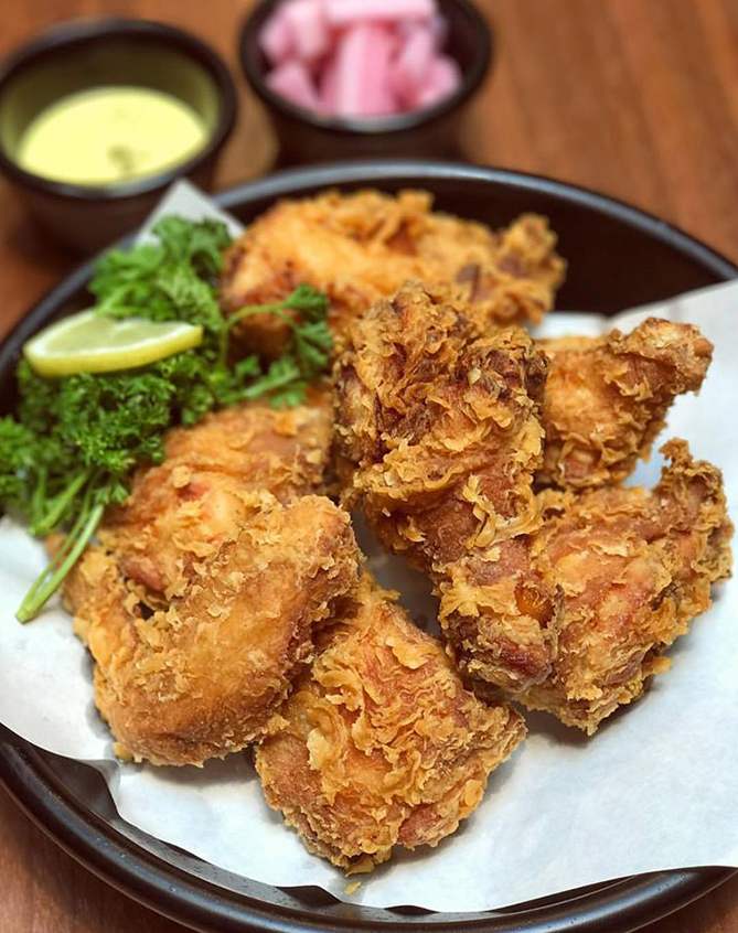 Karaage là gà rán kiểu Nhật Bản. Đây là món ăn quen thuộc ở xứ sở mặt trời mọc và độ phổ biến của nó tại đây được ví như bánh pizza tại Mỹ. Món gà dễ nấu, dễ ăn, được làm nhiều ở nhà và cả ngoài hàng. Trước khi đem đi chiên giòn, karaage được ướp trong hỗn hợp nước tương, rượu sake, tỏi và gừng. Món gà có thể ăn ngon cả lúc nóng và nguội, được vắt ít chanh trước khi cho vào miệng. Karaage thường được thưởng thức kèm rượu sake hoặc bia lạnh. Ảnh: Facebook Ramen Samurai