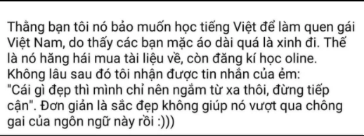 Liên quan đến câu chuyện học Tiếng Việt. Một chàng trai Tây balo đã chia sẻ câu chuyện vui của mình: "Thằng bạn tôi nó bảo muốn học Tiếng Việt để làm quen con gái Việt Nam, do thấy các bạn mặc áo dài xinh quá đi. Thế là nó hăng hái mua tài liệu về, còn đăng ký học online.