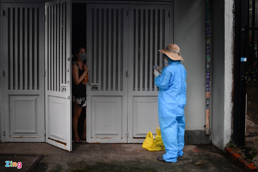 Nhân viên y tế hướng dẫn người dân quận Bình Thạnh tự làm test nhanh tại nhà. Ảnh: Duy Hiệu.