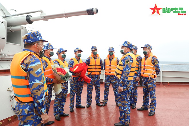 Đại tá Trịnh Xuân Tùng, Phó tư lệnh Vùng 4 Hải quân, Trưởng đoàn công tác HQND Việt Nam, tặng hoa chúc mừng kíp bắn pháo AK 176 sau khi hoàn thành xong bài thi.
