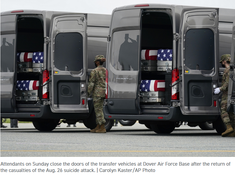 It was all too late. The bombing, at 6 p.m. Kabul time, came as Austin and Milley were in the White House conferring with the president. The blast ripped through the crowd of civilians and U.S. military personnel at Abbey Gate, killing roughly 200 — including 13 U.S. service members, whose remains were repatriated at a solemn ceremony Sunday at Dover Air Force Base attended by Biden, Austin, Milley and other officials.