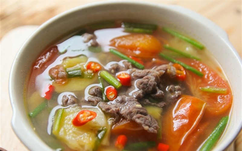 Khi bò đã bắt đầu mềm, cho cà chua vào, nêm lại cho vừa miệng. Khi hỗn hợp sôi trở lại, cho cần tây vào và tắt bếp.