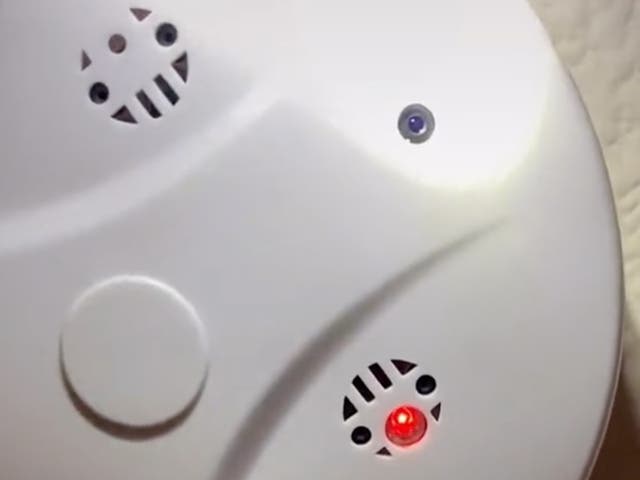 “Điều đầu tiên, hãy nhìn vào những vị trí kẻ xấu có thể muốn theo dõi để tìm camera quay lén”, Hutchins chỉ vào camera ngụy trang máy báo cháy, được gắn ngay trên giường ngủ trong phòng khách sạn.