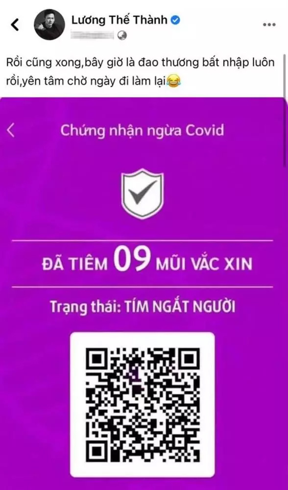 Đính kèm dòng trạng thái là bức ảnh chứng nhận đã tiêm phòng. Tuy nhiên, thay vì 2 mũi như bao công dân khác, Lương Thế Thành lại có con số khiến nhiều người bất ngờ: 9 mũi.