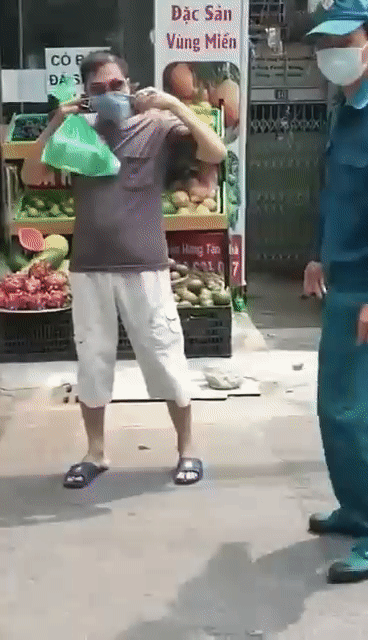Khi bị cưỡng chế, người đàn ông này có rút khẩu trang ra đeo nhưng được vài phút lại tháo xuống, tiếp tục la lớn: 'Tao xin rồi, thằng kia cho tao vào. Nhà tao bên kia...'.