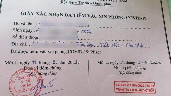 Theo danh sách này, có tổng số 362 người được tiêm mũi một trong ngày 11/8. Trong đó, 57 người dưới 18 tuổi, 10 em nhỏ 14 tuổi, 12 em 13 tuổi và 6 em mới 12 tuổi.Ngoài danh sách trên, người dân ở Cần Thơ còn lan truyền một hình chụp "Phiếu sàng lọc trước tiêm chủng vắc xin phòng Covid-19", khai tên P.Đ.T. (12 tuổi), là học sinh ngụ phường Trung Kiên, quận Thốt Nốt.