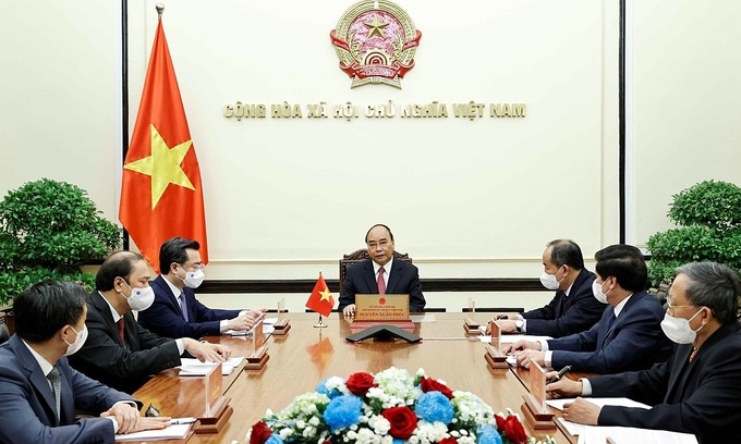 Chủ tịch nước Nguyễn Xuân Phúc (giữa) trong cuộc điện đàm với Chủ tịch Cuba Miguel Diaz-Canel tối 23/8. Ảnh: BNG.