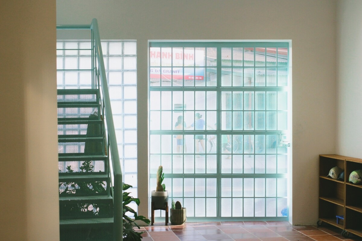 Đầu tiên, mặt tiền cũ kỹ, đơn điệu và thiếu sáng của ngôi nhà được thay bằng gạch kính và cửa thép lỗ, giúp ánh sáng tự nhiên dễ dàng đi vào bên trong, căn nhà rộng rãi, bừng sáng hơn.