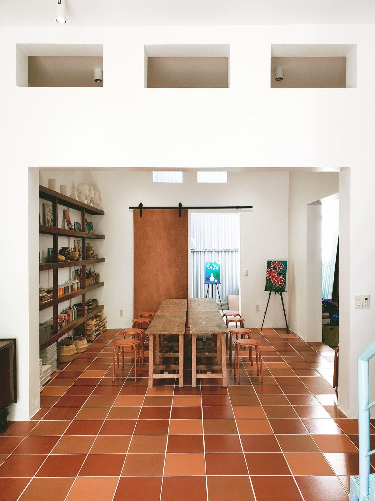 Ở tầng trệt, gia chủ muốn mở xưởng vẽ cho thiếu nhi nên những ô cửa sổ cũ được đục rộng ra thành lối đi lại, kết nối trực tiếp với sân sau và hành lang đi lại bên cạnh nhà. Sau cải tạo, tầng trệt trở thành một không gian "mênh mông", thỏa mãn mơ ước của chủ nhân.