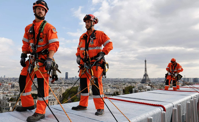 Khi bọc lại, nhóm kỹ sư phải chú ý bảo vệ Khải Hoàn Môn và các điểm trang trí của nó, từ những hình điêu khắc cho đến đường phào chỉ phức tạp. Mặc dù họ được phép khoan một số lỗ trên cột nhưng phải đảm bảo giảm thiểu thiệt hại. Ảnh: Ludovic Marin/AFP
