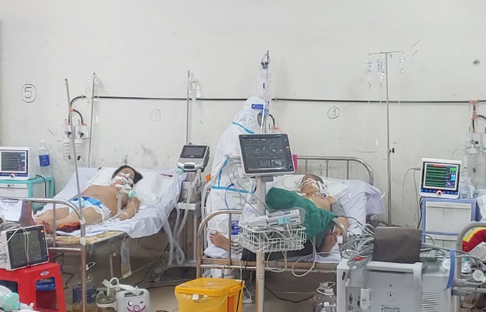 Bệnh nhân ung thư giai đoạn cuối (bên phải) đang được thở máy tại Bệnh viện dã chiến điều trị Covid-19 TP Thủ Đức số 1.