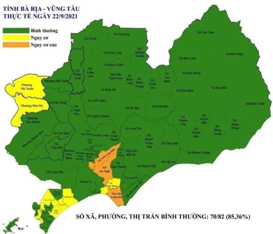Theo BCĐ tỉnh Bà Rịa - Vũng Tàu, từng là địa phương có số ca mắc Covid-19 tăng cao và được xếp vào “mức nguy cơ”, nhưng đến nay tình hình dịch bệnh ở tỉnh này đã xuống mức bình thường và không còn “vùng đỏ” trên bản đồ Covid-19, các khu vực “vùng cam - vàng” đang tiến gần đến mục tiêu xanh hóa.