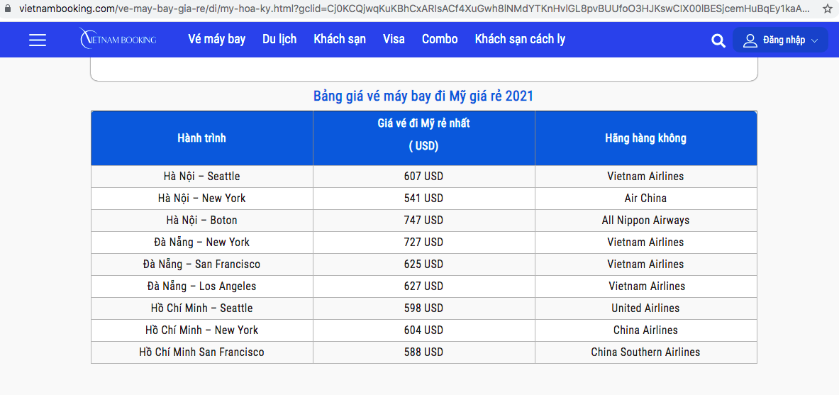 Bảng giá vé máy bay đi Mỹ giá rẻ 2021, đang được niêm yết trên VietnamBooking. Ảnh: Chụp màn hình