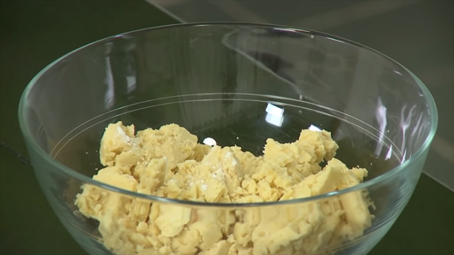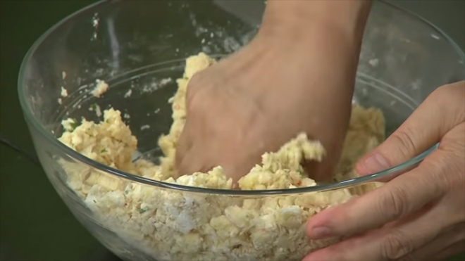 Sau khi đậu đã nhuyễn thì thêm trứng, tùy lượng đậu mà mọi người thêm lượng trứng cho phù hợp, thêm gia vị vừa ăn, đánh đều đến khi thành 1 hỗn hợp sền sệt, thêm hành lá, rau thơm (có thể rau thơm, rau mùi hay mùi tàu đều được) thái nhỏ. Sau đó rán lên, 2 mặt vàng đều là được.