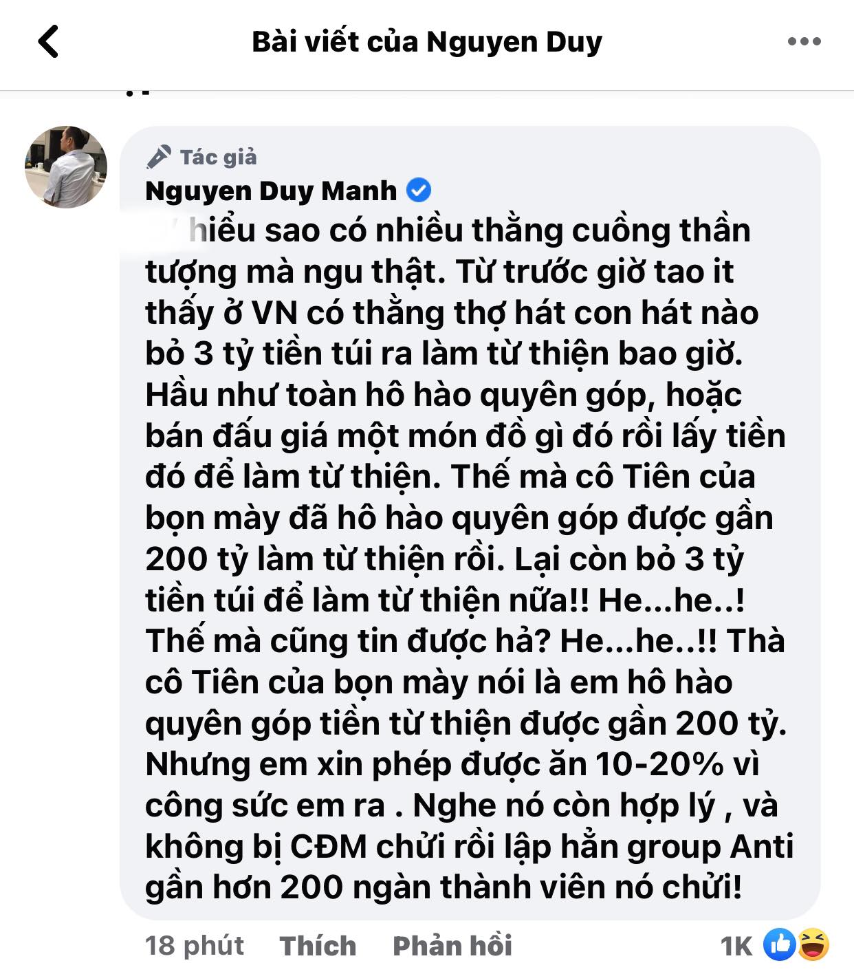 “*** hiểu sao có nhiều thằng cuồng thần tượng mà ngu thật. Từ trước giờ tao ít thấy ở VN có thằng thợ hát con hát nào bỏ 3 tỷ tiền túi ra làm từ thiện bao giờ. Hầu như toàn hô hào quyên góp, hoặc bán đấu giá một món đồ gì đó rồi lấy tiền đó để làm từ thiện. Thế mà cô Tiên của bọn mày đã hô hào quyên góp được gần 200 tỷ làm từ thiện rồi. Lại còn bỏ 3 tỷ tiền túi để làm từ thiện nữa!! He…he..! Thế mà cũng tin được hả? He…he..!! Thà cô Tiên của bọn mày nói là em hô hào quyên góp tiền từ thiện được gần 200 tỷ. Nhưng em xin phép được ăn 10 – 20% vì công sức em bỏ ra. Nghe nó còn hợp lý, và không bị CĐM chửi rồi lập hẳn group Anti gần hơn 200 ngàn thành viên nó chửi!”.