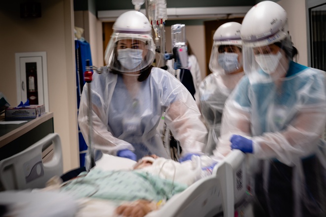 Các bác sĩ ở Arkansas di chuyển một bệnh nhân Covid-19 triệu chứng nặng. Ảnh: New York Times.