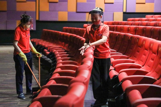 Nhân viên một rạp chiếu phim ở quận 1 dọn dẹp sau khi TP HCM dừng dịch vụ không thiết yếu để chống Covid-19, tháng 5/2020. Ảnh: Quỳnh Trần
