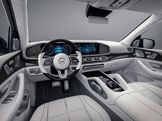 Di chuyển vào trong khoang lái, nội thất của xe sẽ được bọc da design với 2 tông màu trắng pha lê và ngọc xám bạc, tương phản với các chi tiết ốp gỗ đen. Ngoài ra, bậc cửa cũng được ốp kim loại với logo Maybach chiếu sáng cùng huy hiệu “Edition 100”.
