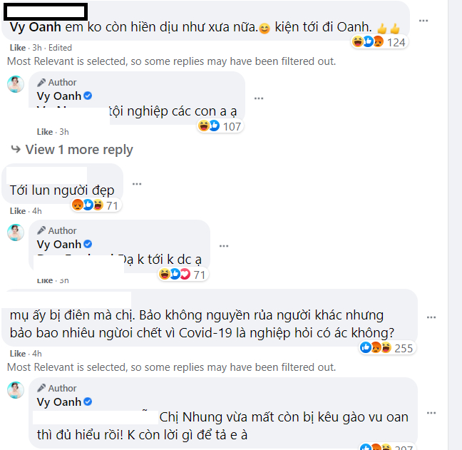 Nữ ca sĩ cũng cho biết quá trình điều tra chỉ mới bắt đầu và hoàn toàn được bảo mật thông tin, việc bà Hằng tung tin đồn là hoàn toàn sai trái và phải chịu trách nhiệm cho hành động của mình. Dưới bài viết của cô, cư dân mạng nhiệt tình ủng hộ với cách làm việc của Vy Oanh và động viên nữ ca sĩ.