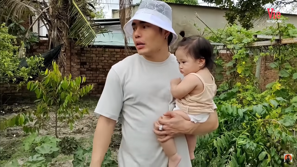 Nói rồi, Lê Dương Bảo Lâm bế con đi hái từng trái mướp, khổ qua để nấu ăn. Vừa hái, anh vừa phải chú tâm xem con có bị muỗi cắn không. Anh nhìn dàn mướp và tỏ ra xót xa: