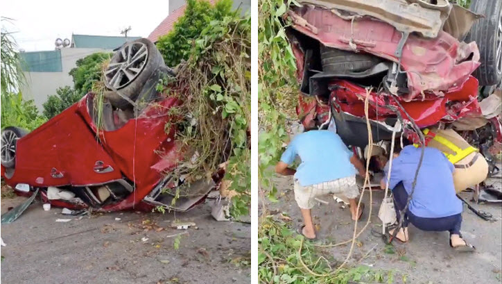Chiếc xe bị hư hỏng nặng, một nam thanh niên bị mắc kẹt bên trong sau cú va chạm