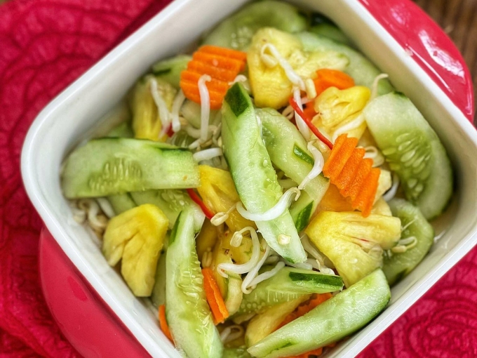 Dưa chuột cùng các loại rau củ giòn giòn, chua ngọt, man mát, dậy mùi tỏi và cay vị ớt, ăn cùng thịt nướng, bánh mì, xôi mặn.