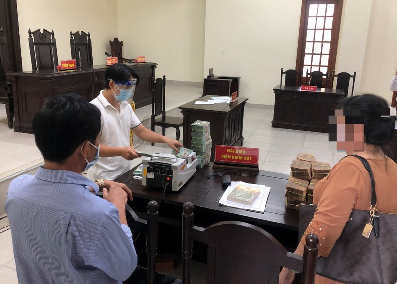 Việc giao nhận tiền tại tòa với số tiền lớn nên bên nhận đã mời nhân viên ngân hàng mang máy tính tiền đến hỗ trợ việc giao, nhận.