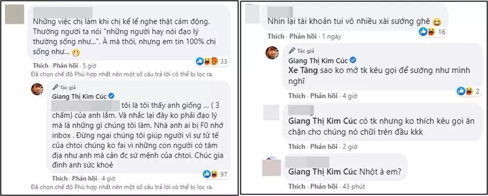 Nhiều người đã tràn vào trang cá nhân của cô để "chất vấn", thậm chí nói thẳng nghi ngờ "bớt xén" từ thiện. Giang Kim Cúc lập tức đáp trả rất gay gắt, tranh cãi tay đôi với dân mạng. Thậm chí, cô còn mỉa mia một người chỉ trích mình: "Nhà anh ai bị F0 nhớ inbox".