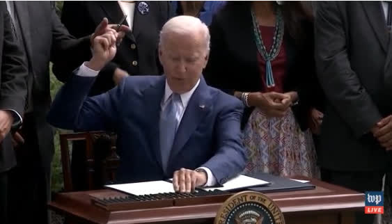 CHUYỆN QUA 3 BỨC ẢNH: Sau khi ho vào tay (không đúng hướng dẫn về đảm bảo y tế cộng đồng) trong 15 phút, ông Joe Biden đã ký các tài liệu bằng cùng tay đó, rồi đưa các chiếc bút cho nhiều người xung quanh.