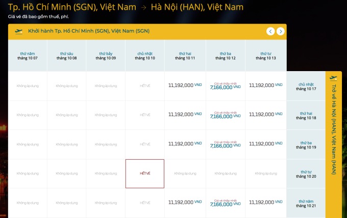 Giai đoạn từ 10-20/10, ngành hàng không thí điểm mở lại 19 đường bay trên cả nước, trong đó chặng hai chiều giữa Sài Gòn - Hà Nội được khai thác mỗi ngày một chuyến, khởi hành từ Hà Nội lúc 13h và từ TP HCM lúc 16h. Giá vé khứ hồi chặng này dao động 7,2 - 11,2 triệu đồng, xấp xỉ giá vé Tết - dịp cao điểm nhất năm. Tuy nhiên, tối 9/10, nhiều người chia sẻ trên các diễn đàn du lịch, không thể mua được tấm vé theo đúng lịch trình mong muốn. Chị Thanh Tú (Hà Nội) kẹt ở Sài Gòn do dịch Covid-19, dự định về thủ đô ngay khi đường bay hoạt động lại nhưng vé ngày 10/10 đã hết. Hơn nữa, giá vé cao khiến chị cân nhắc chờ thêm vài ngày.