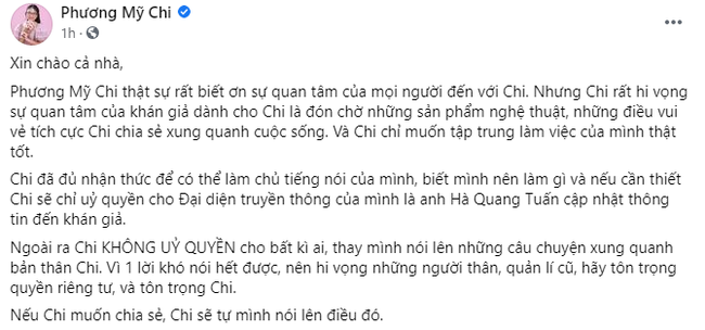 Cụ thể, Phương Mỹ Chi cho biết: "Chi đã đủ nhận thức để có thể làm chủ tiếng nói của mình, biết mình nên làm gì và nếu cần thiết Chi sẽ chỉ uỷ quyền cho Đại diện truyền thông của mình là anh Hà Quang Tuấn cập nhật thông tin đến khán giả".