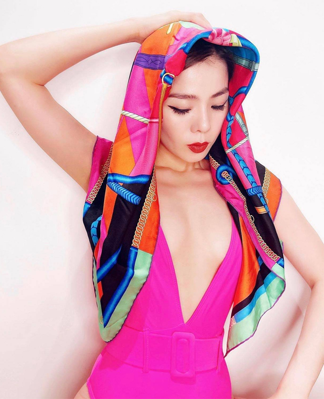 Lệ Quyên diện bikini 1 mảnh màu hồng neon nổi bật mix với khăn họa tiết Hermès.