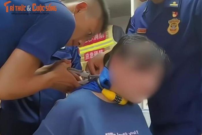 Lính cứu hỏa phải dùng kìm để cắt chiếc khóa. Ảnh: Weibo