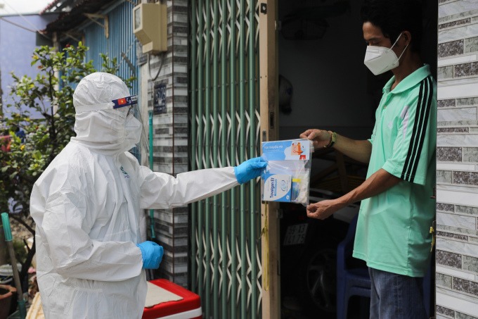 Nhân viên y tế phường Linh Tây (TP Thủ Đức), TP HCM thăm khám và phát thuốc cho F0 điều trị tại nhà, ngày 3/9. Ảnh: Quỳnh Trần