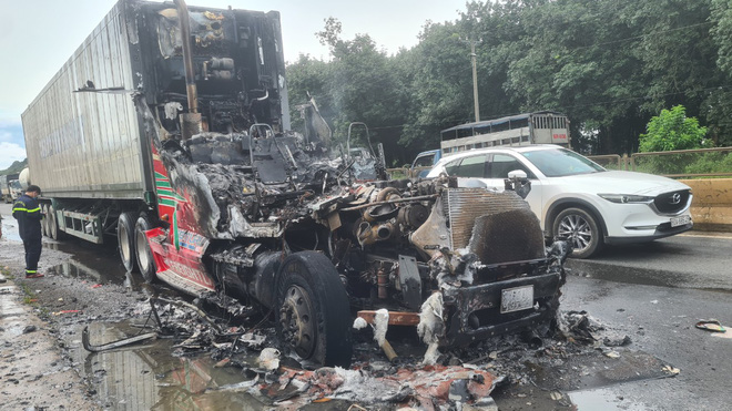 Chiều tối 16/10, lực lượng chức năng TP. Long Khánh (tỉnh Đồng Nai) cho biết vừa hoàn tất công tác khám nghiệm hiện trường vụ cháy xe container trên QL1 khiến toàn bộ phần đầu xe bị thiêu rụi.