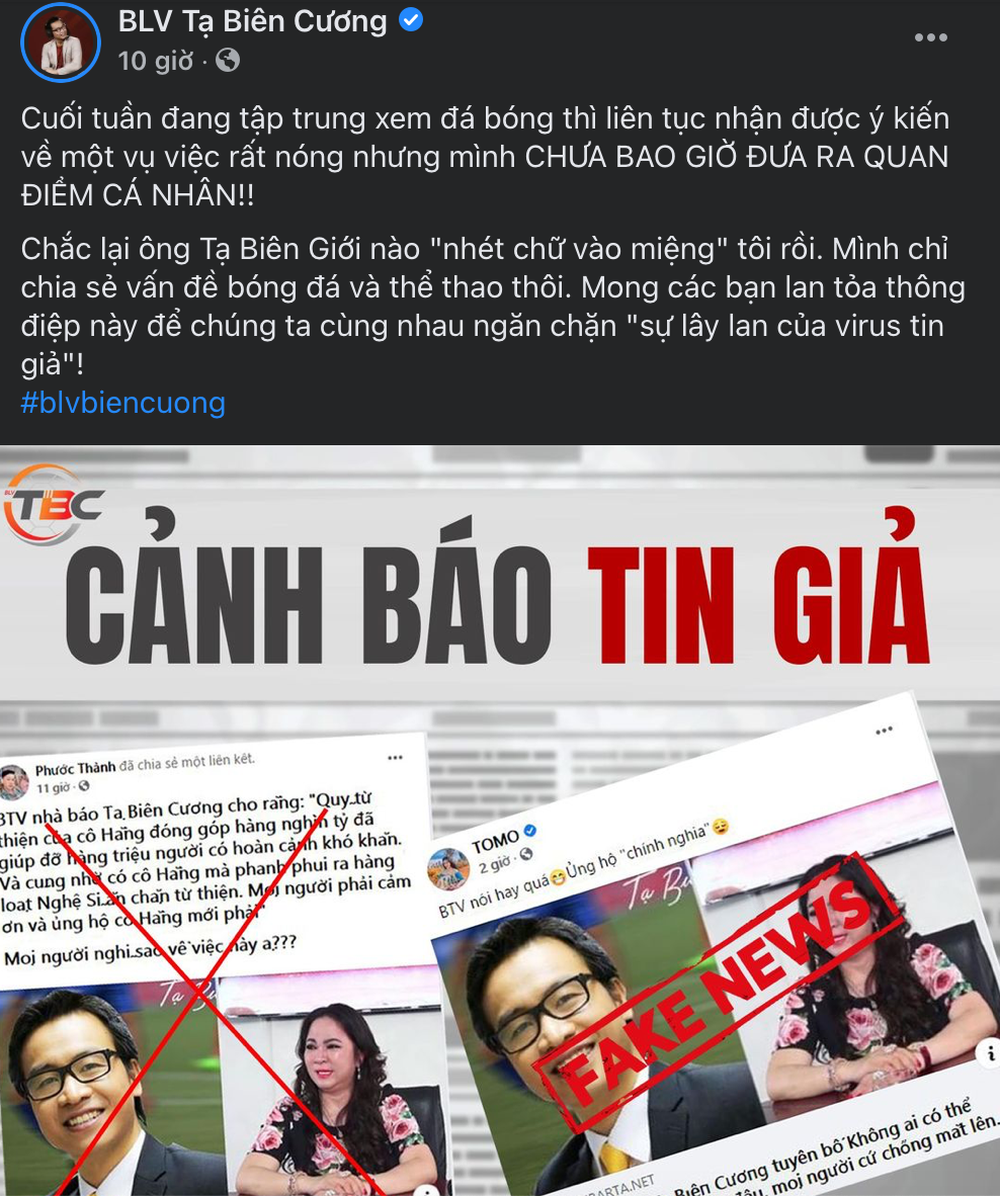 Cụ thể, không rõ vì lý do gì mà thời gian gần đây trôi nổi trên nhiều diễn đàn, các đối tượng xấu đã cố tình tạo ra tin BLV Tạ Biên Cương "cùng phe" bà Phương Hằng trong ồn ào từ thiện của nghệ sĩ, thậm chí còn "áp đặt" anh đã nói: “BTV – Nhà báo Tạ Biên Cương tuyên bố không ai có thể thay thế được cô Hằng đâu, mọi người cứ chống mắt lên”.