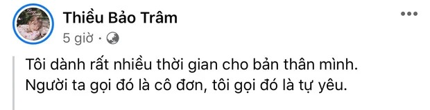 Chiều 21/10, Thiều Bảo Trâm đăng ảnh khoe khéo bờ vai quyến rũ. Thần thái sang chảnh, vóc dáng cao ráo của Thiều Bảo Trâm khiến cõi mạng rần rần. Tuy nhiên điều gây chú ý là cô đính kèm dòng trạng thái: "Tôi dành rất nhiều thời gian cho bản thân mình. Người ta gọi đó là cô đơn, tôi gọi đó là tự yêu". Giữa nghi vấn "gương vỡ lại lành" với Sơn Tùng, Thiều Bảo Trâm dường như đang ẩn ý đang trong tình trạng độc thân và dành thời gian chăm sóc cho bản thân.
