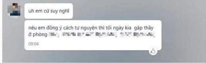 Khi nữ sinh này tỏ ý "từ chối" vì đã có bạn trai thì người đàn ông trấn an bằng tin nhắn: “Em không phải lo nghĩ về vấn đề bị lộ ra ngoài. Thầy đảm bảo giữ kín chuyện này và không ràng buộc lâu dài”.