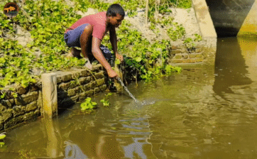 Một người đàn ông đã mang một con gà (đã được làm sạch lông) ra chân cầu. Rồi buộc nó vào đầu sợi dây xích, sau đó thả con gà xuống nước. Người này liên tục giật nhẹ sợi dây xích.