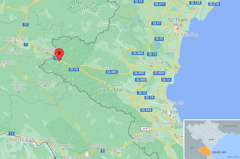 Thị trấn Mường Xén, huyện Kỳ Sơn, tỉnh Nghệ An (chấm đỏ), nơi xảy ra vụ việc. Ảnh: Google Maps.