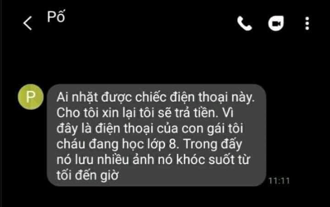 Thời gian gần đây, cô gái đi khôi phục lại số điện thọai bị mất mới nhìn thấy dòng tin nhắn vô cùng cảm động của bố gửi cho người nhặt được chiếc điện thoại của mình thời điểm đó. Dòng tin nhắn vọn vẹn như sau: "Ai nhặt được chiếc điện thoại này. Cho tôi xin lại tôi sẽ trả tiền vì đây là điện thoại của con gái tôi, cháu đang học lớp 8. Trong đấy nó lưu nhiều ảnh, nó khóc suốt từ tối đến giờ".