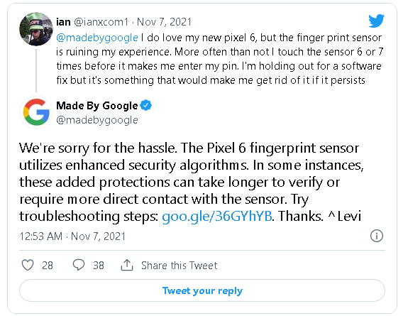 Trong câu trả lời của mình trên Twitter, Google giải thích lý do là vì “các thuật toán bảo mật nâng cao” mà cảm biến vân tay của Pixel 6 sử dụng. Google cho biết rằng các biện pháp bảo mật nâng cao này có thể khiến cho việc đọc dấu vân tay của người dùng mất nhiều thời gian hơn để xác minh, hoặc yêu cầu thời gian tiếp xúc với cảm biến nhiều hơn.