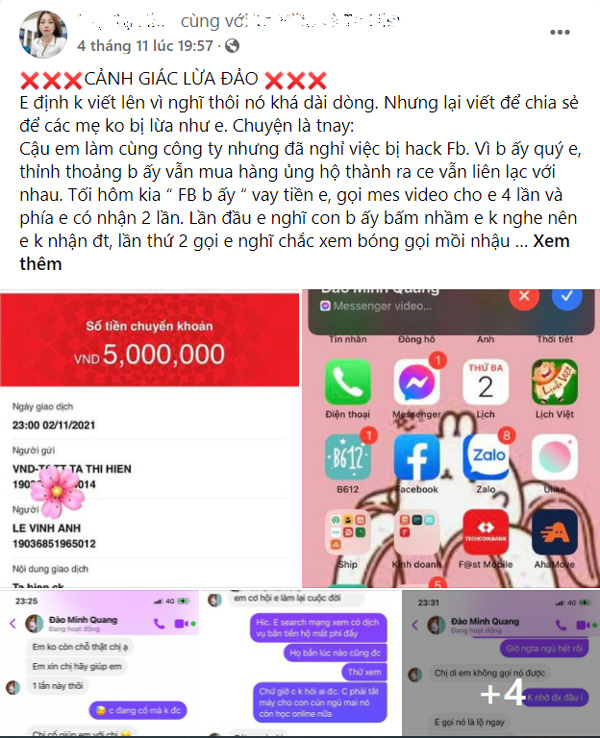 Vào ngày 2/11, một người em làm cùng công ty của chị nhưng đã nghỉ việc, bị hack Facebook. “Vì em ấy rất quý tôi, thỉnh thoảng vẫn hay mua hàng ủng hộ tôi (vì tôi bán hàng online). Vì vậy, 2 chị em vẫn liên lạc với nhau. Tối hôm đó, tài khoản mạng xã hội của cậu ấy bỗng nhắn tin với nội dung vay tiền và chủ động gọi video cho tôi tận 4 lần. Nhưng tôi chỉ nghe 2 lần”, chị kể lại.
