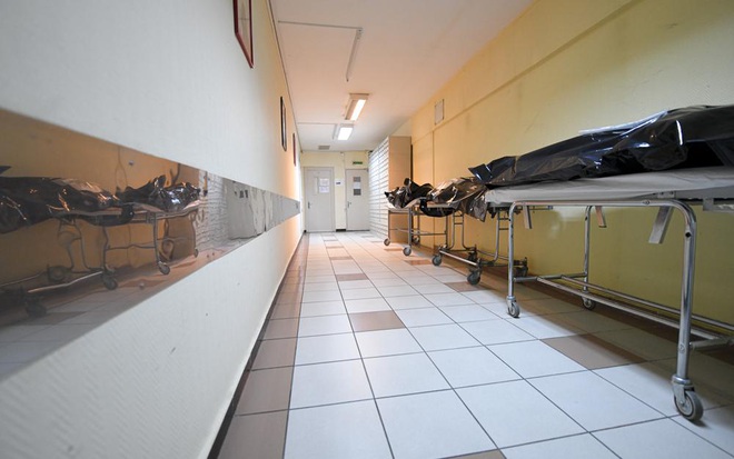 Thi thể được đặt dọc hành lang ở Bệnh viện Cấp cứu Đại học Bucharest, Romania vì không còn chỗ trong nhà xác (Ảnh: AP).